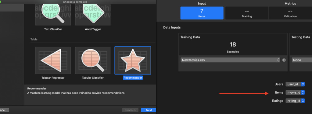 Now let’s launch our Create ML application, which is a part of Xcode 11.3 and above, and select the Recommender template. Inside that, the CSV file that we saw earlier would be fed as the input. Create ML automatically identifies the number of unique items.