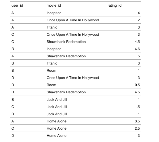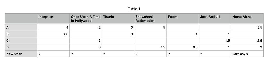 Here’s an illustration of the user-item (movie) matrix, where on the basis of the predictions made by the four users and the new user’s ratings, our model should predict the most similar ones. If a user hasn’t rated a movie, it’s considered as 0.