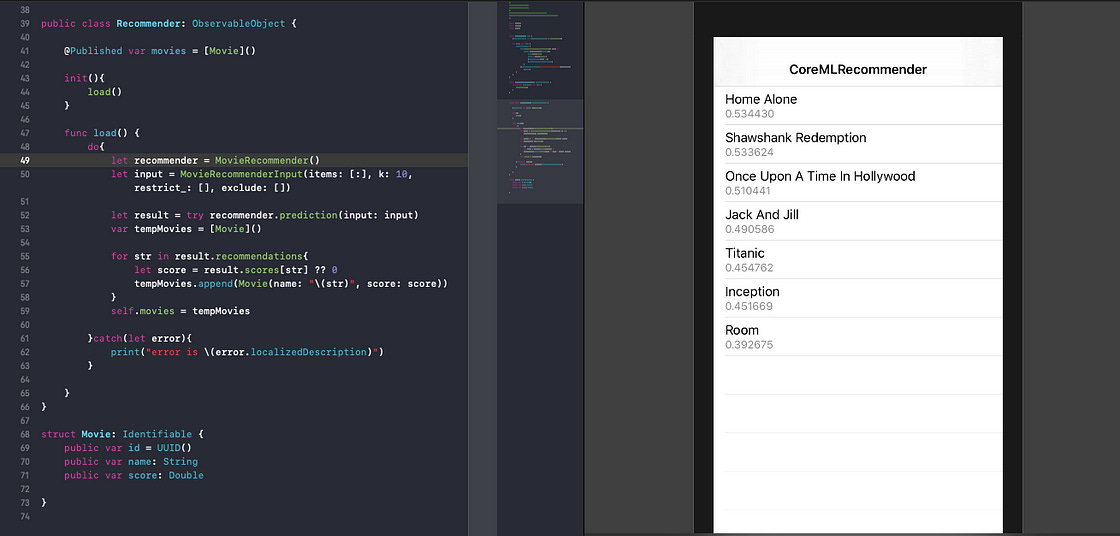 MovieRecommenderInputis the auto-generated class from our Core ML model. We pass our user input here, which is a dictionary of item-rating pairs.kargument takes as a value the number of similar items to be returned by the model output.In the
