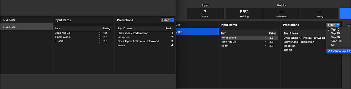 Next, just press the training button. Our model should be ready very quickly time given the small size of the dataset. You can then create live users in the output panel and test the recommendations, as shown below: