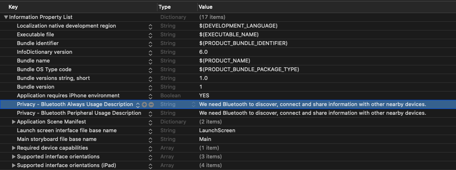For backward support for older iOS versions, NSBluetoothPeripheralUsageDescription needs to be defined as well.