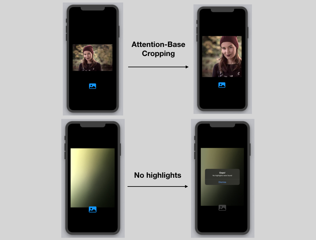 VNImageRectForNormalizedRectto project the salient region into the UIKit coordinate system.In cases, where the image has no highlights, the