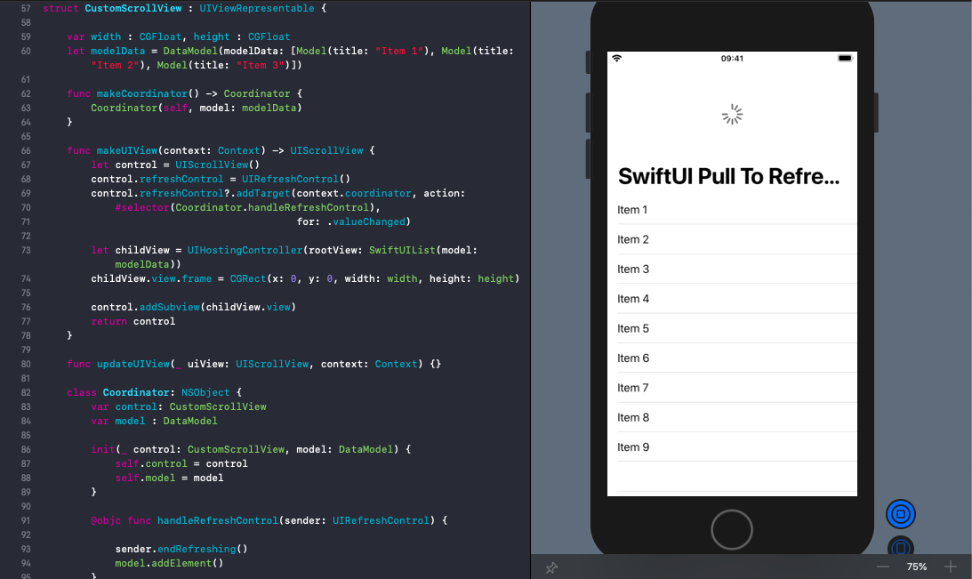 makeUIViewfunction. It responds to the user events on the refresh control and appends a new element to theDataModelonce the refresh is done.SwiftUIListis the custom SwiftUI view we’ve created that holds theDataModelin a List. Using theUIHostingController, we embed theSwiftUIListas a childUIViewof theUIScrollView.